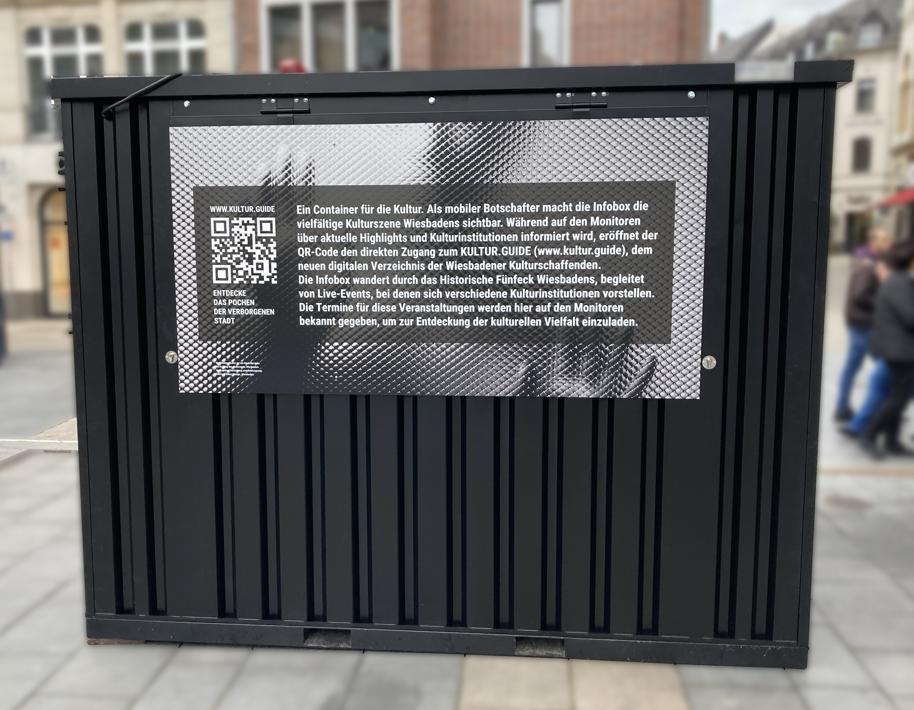 Noch bis November ist an wechselnden Standorten im historischen Fünfeck der Kultur-Container (Info-Box Kultur) zu finden. Dieser versorgt Interessierte mit Infos zu den Kulturangeboten in Wiesbaden.